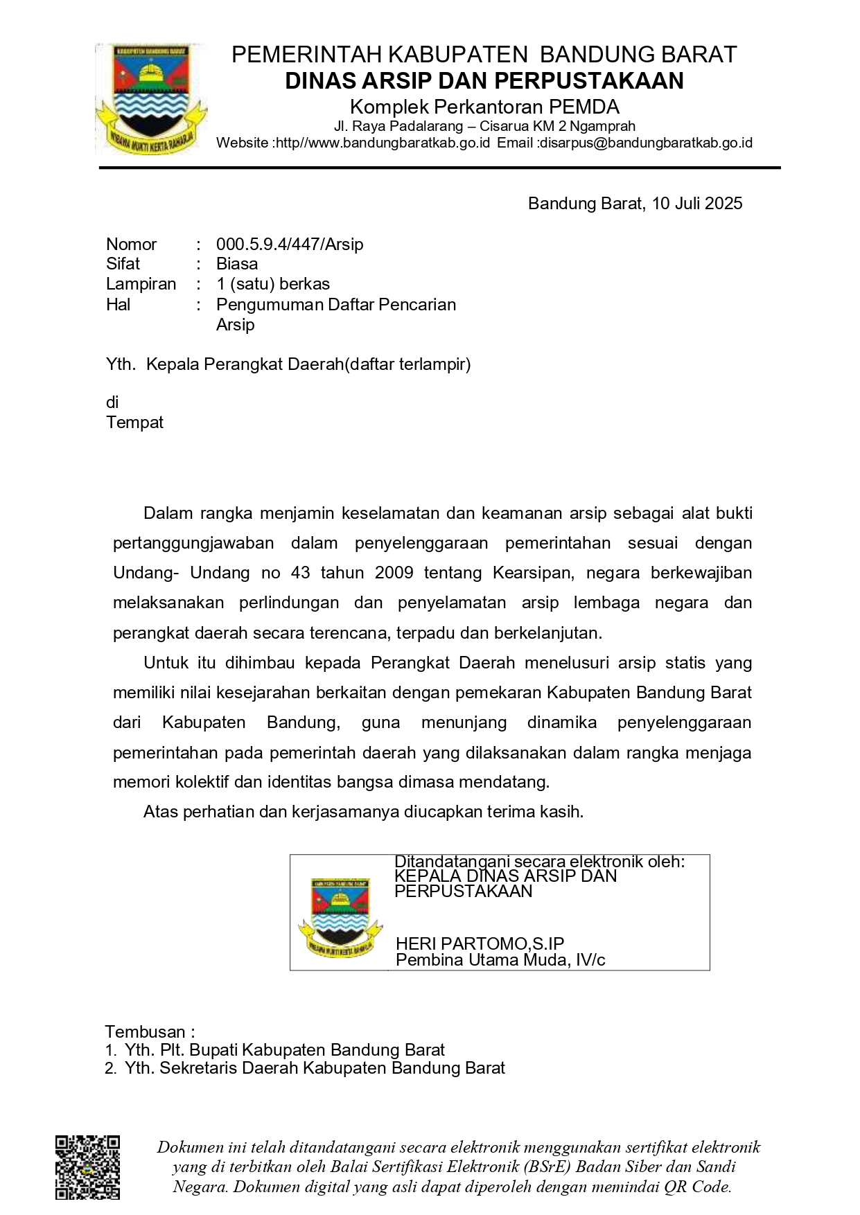 Dalam rangka menjamin keselamatan dan keamanan arsip sebagai alat bukti pertanggungjawaban penyelenggaraan pemerintahan, Dinas Arsip dan Perpustakaan Kabupaten Bandung Barat mengumumkan daftar arsip yang sedang dalam pencarian. Langkah ini merupakan implementasi dari amanat Undang-Undang Nomor 43 Tahun 2009 tentang Kearsipan, di mana negara berkewajiban melindungi dan menyelamatkan arsip lembaga negara dan perangkat daerah secara terencana, terpadu, dan berkelanjutan.